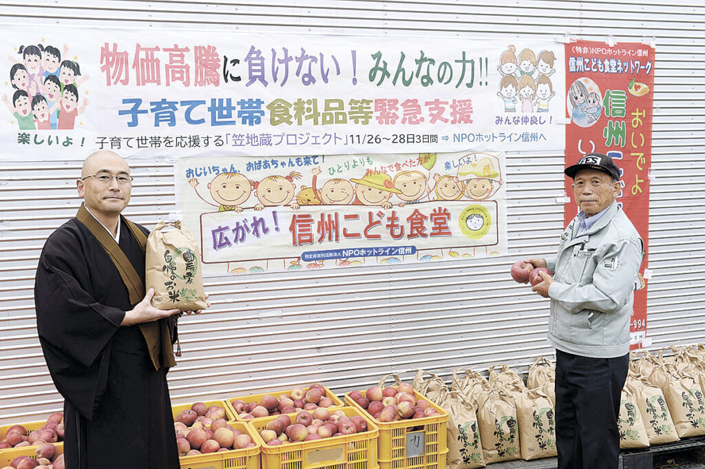 プロジェクトは玄向寺(松本市大村)が企画した活動で、26~28日に、子ども食堂を運営するNPOホットライン信州(同市寿北)で食料品を受け付ける。米や野菜、果樹のほか、日持ちのする品物の提供を呼び掛ける。すでに市内の農家から米200トンやリンゴが寄せられた。