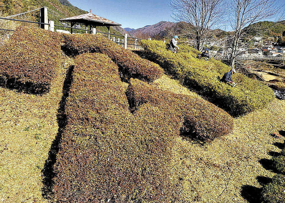 この日は公園一帯の美化に10人余りが取り組んだ。花文字「天白公園」の刈り込みでは「園の文字はどの程度再現する?」「難しいわ」などと笑い声が飛び交い、和やかな雰囲気に包まれた。長年手をかけてきた植栽に最後の手を加える作業には、名残を惜しむ思いもにじんでいた。