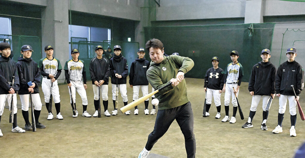 牧選手は豪快なスイングも披露した。教室の最後に「野球を好きなことが一番大事。その気持ちを忘れないで」と語り掛けた。松本西リトルシニアの伊藤優介さん(13)=松本市波田中学校1年=は「ただの思い出にならないよう、しっかりと生かしていきたい」と話していた。