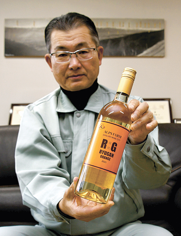 塩尻町のアルプスは、市内の自社農園アルプスファームで10月に収穫したブドウで仕込んだ「ALPS FARM 塩尻竜眼オレンジ2025」を9日に発売する。やや辛口で限定1500本を用意する。今年は日照量が豊富で雨も少なく、ブドウが順調に成長した。自社農園での竜眼の栽培面積は約3ヘクタールあり、来年にはさらに増やす予定だ。矢ケ崎学社長は「信州サーモンやそばにも合わせやすく、ワインがアクセントになる。ワインの消費が落ち込む中、面白そうだなと興味を持ってほしい」と話す。720ミリリットル入りで税込み1980円。