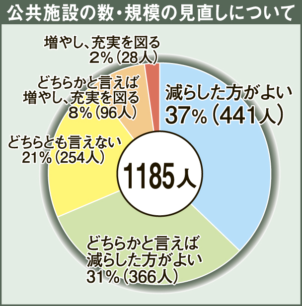 人口や財政状況に応じて施設の数・規模を「減らした方がよい」が37%(441人)、「どちらかと言えば減らした方がよい」が31%(366人)と多くを占めた。「どちらとも言えない」が21%(254人)、「どちらかと言えば―」を含む「増やして充実を図った方がよい」は10%(124人)だった。