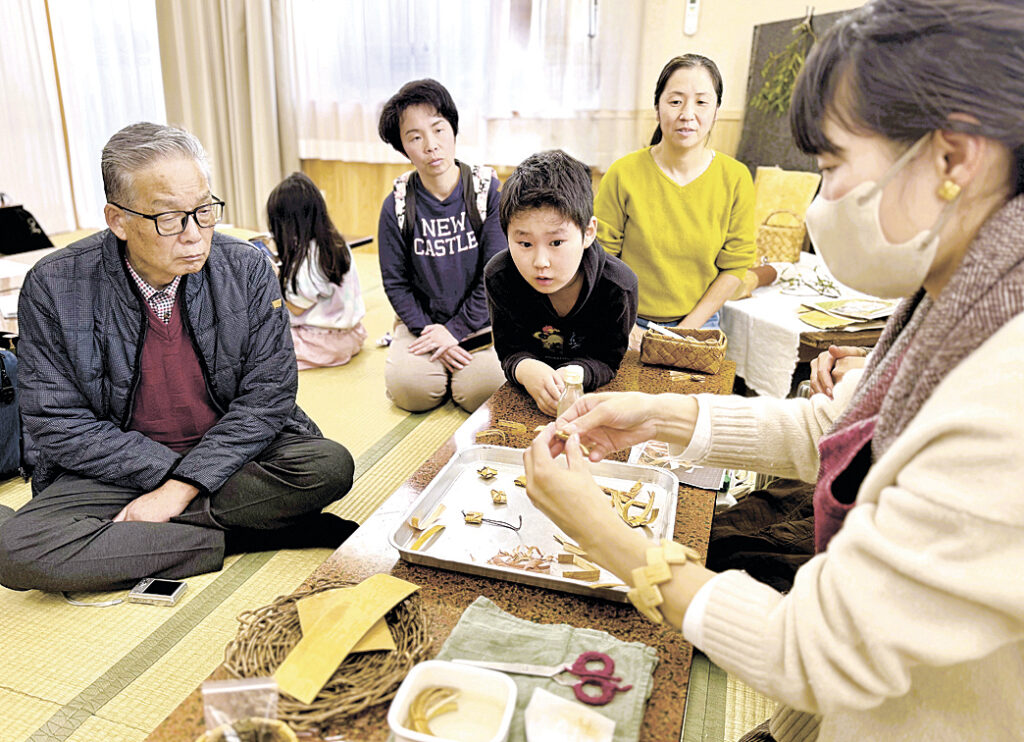 開田のシラカバの保全と活用を目指す「白樺部」の川下美帆さん=西野=と小林涼子さん=末川=に教わりながら、樹皮を編んで小物を完成させた。里山で自然体験が楽しめる遊びの場・美しき里わんぱく村(木曽町日義)村長の巾恒美さんは「クラフトへの活用は面白い」と感心し、妻籠を愛する会(南木曽町)理事長の藤原義則さんは「名刺に応用できそう」と提案していた。