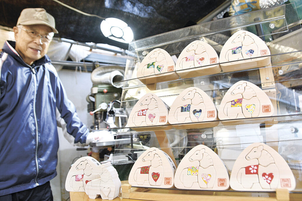 置物は木曽のヒノキ材を高さ7センチ、幅9センチ、厚さ3センチのおにぎり形に加工した。糸のこぎりで馬の形を切り抜き、やすりで磨いてもう一度はめ立体的な仕上がりにする。六つのパーツから成り、このうち胴体の「ハート形」と背中の部分には華やかな布をあしらった。
