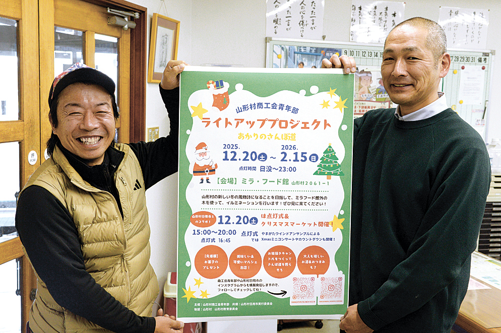 山形村商工会青年部(根橋昌希部長)が、ミラ・フード館南側のケヤキにイルミネーションを施す「ライトアッププロジェクト」を計画している。20日~来年2月15日に一帯を明るく照らし、冬のにぎわい創出につなげようと初めて行う。初日は点灯式とクリスマスマーケットで幕開けを飾る。