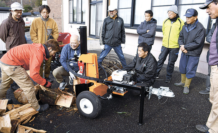 市の地域重点プロジェクト事業補助金で購入した機械類の講習会が中山公民館で開かれ、若手を含む約20人が参加。伐採木の枝をチップ化する粉砕機やまき割り機、木材運搬機などの取り扱いを体験しながら学んだ。