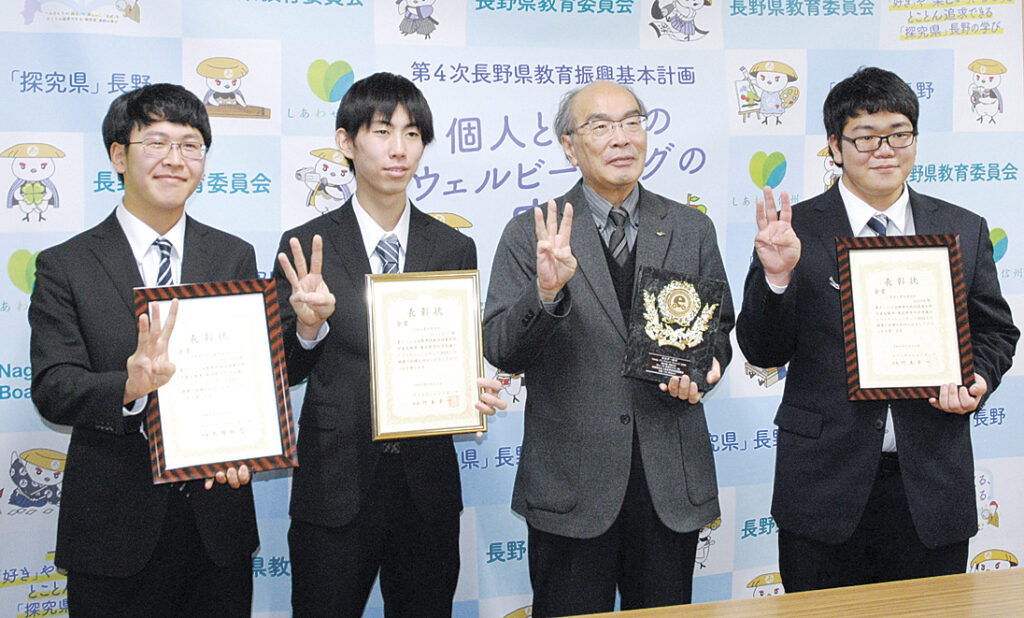 松本工業高校(松本市)原動機部が、中学・高校生による手作り電気自動車のコンテスト「エコ1チャレンジカップ」で3連覇を果たした。3年生部員が16日、県庁を訪れて県教育委員会の武田育夫教育長らと懇談し、大会を振り返りながら3年連続で「金賞」を勝ち取った喜びを語った。