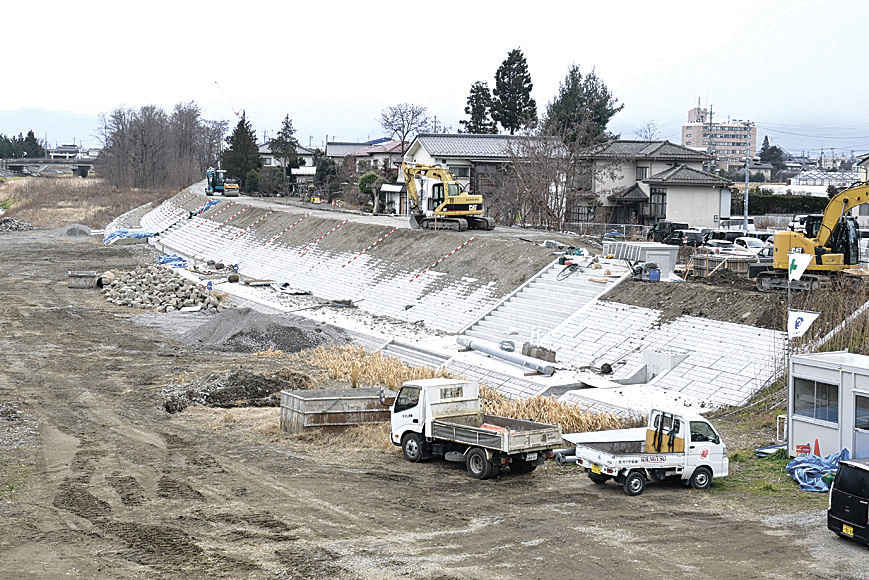 堤防のかさ上げは、護岸工事の部分を含む293・5メートルで実施している。切れ目のある堤防・霞堤だったとみられるくぼんだ箇所があり、従来比で最大2・5メートル上げる。幅は従来とほぼ同じ3・5メートル。本年度の事業費は約7000万円になる。