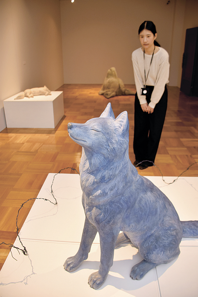 平良さんは、主にクスノキで動物を表現し、岩絵の具で彩色する。穏やかに目を閉じるオオカミか犬の特徴を捉えた生き物を有刺鉄線で囲った大作は、イスラエルとパレスチナの紛争に「表現者として何ができるのか」と揺り動かされ、「自分の祈りを形にした作品」という。