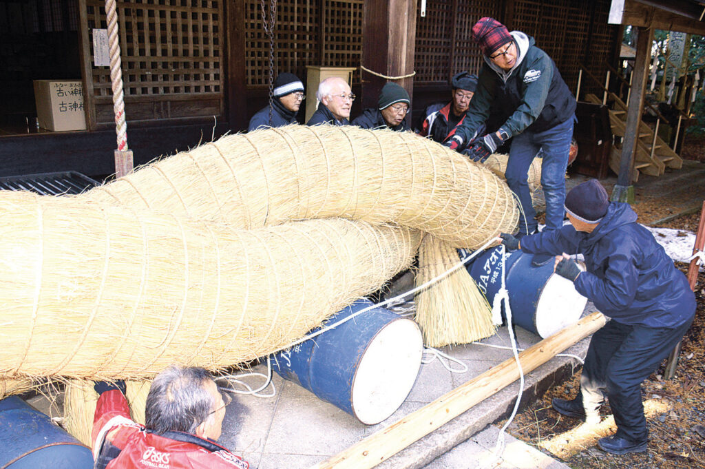 松本市梓川梓の大宮熱田神社で19日、新しい大しめ縄の飾り付けが行われた。3年に1度、氏子総代25人全員が入れ替わり、任期最初の年に新調する。この1週間、全てに優先して毎日朝から夕方まで作業し、長さ9メートルのしめ縄を完成させた。