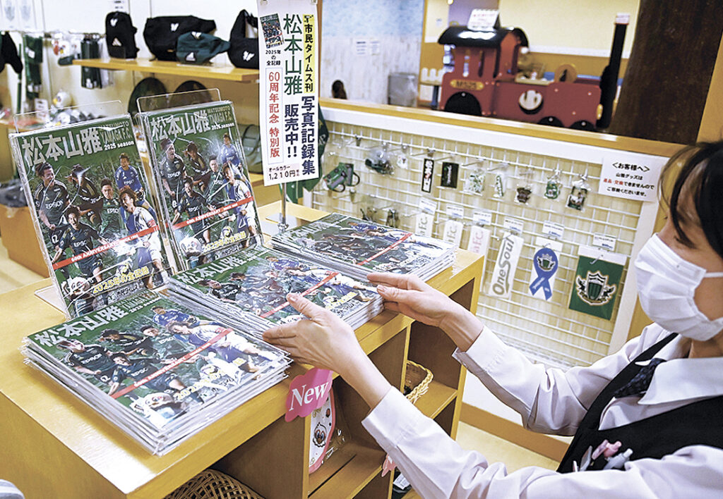 大型商業施設・井上アイシティ21(山形村)内の公式ショップには30冊が入荷した。「シーズンのまとめとして求める人は多く、反応は毎年いい」(勝俣武彦課長)という。20、21日の「山雅ミュージアム」から年始にかけて山雅関連のイベントが続く中、発売のタイミングを含めて来店客の関心を呼ぶことに期待した。