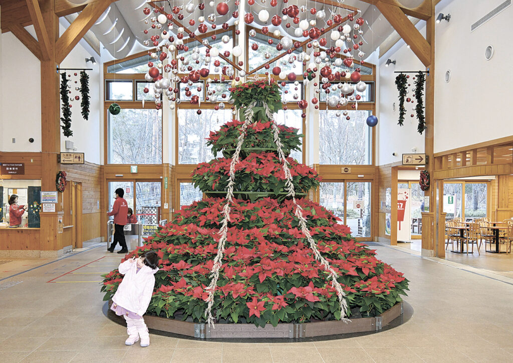 もうすぐクリスマス。気分が盛り上がる巨大な「ポインセチアツリー」が安曇野市の国営アルプスあづみの公園堀金・穂高地区のガイドセンターに飾られ、施設を華やかに彩っている。