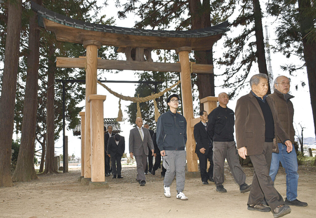 松本市里山辺の八坂神社で鳥居の修繕が完了し、21日に通り初めが行われた。地元町会役員や氏子総代ら関係者約20人が参列。二年参りや初詣で参拝者が増える時期を前に竣工し、生まれ変わった鳥居で迎えられることを喜んだ。