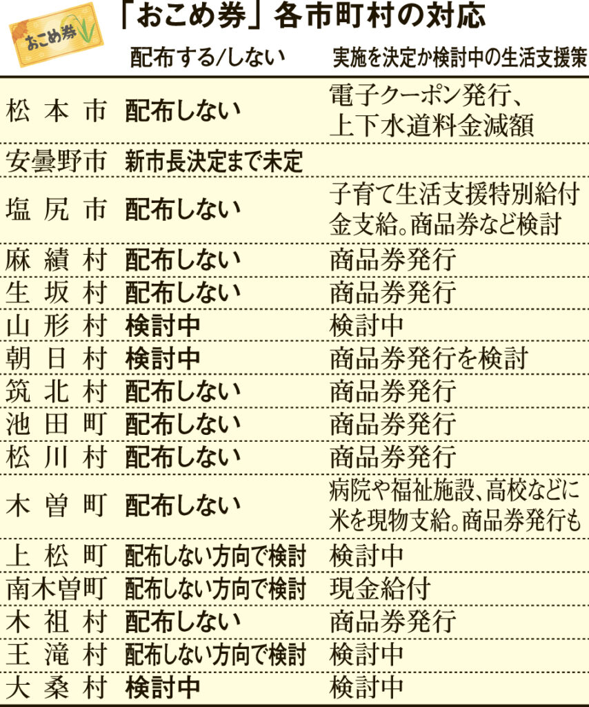 おこめ券の配布予定ゼロ 中信地方16市町村