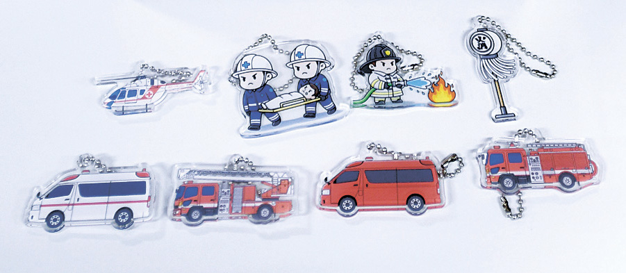 松本市消防団は、消防の仕事などをPRするオリジナルのアクリルキーホルダーを作製した。救急車や消防車、はしご車、ドクターヘリコプターといった車両のほか、消防士や救急隊員などをモチーフにした8種類・計120個で、子供が喜びそうなデザインだ。来年1月4日にエア・ウォーターアリーナ松本(美須々)などで行う消防出初め式のイベント会場でのスタンプラリーで、カプセルトイとして活用する。