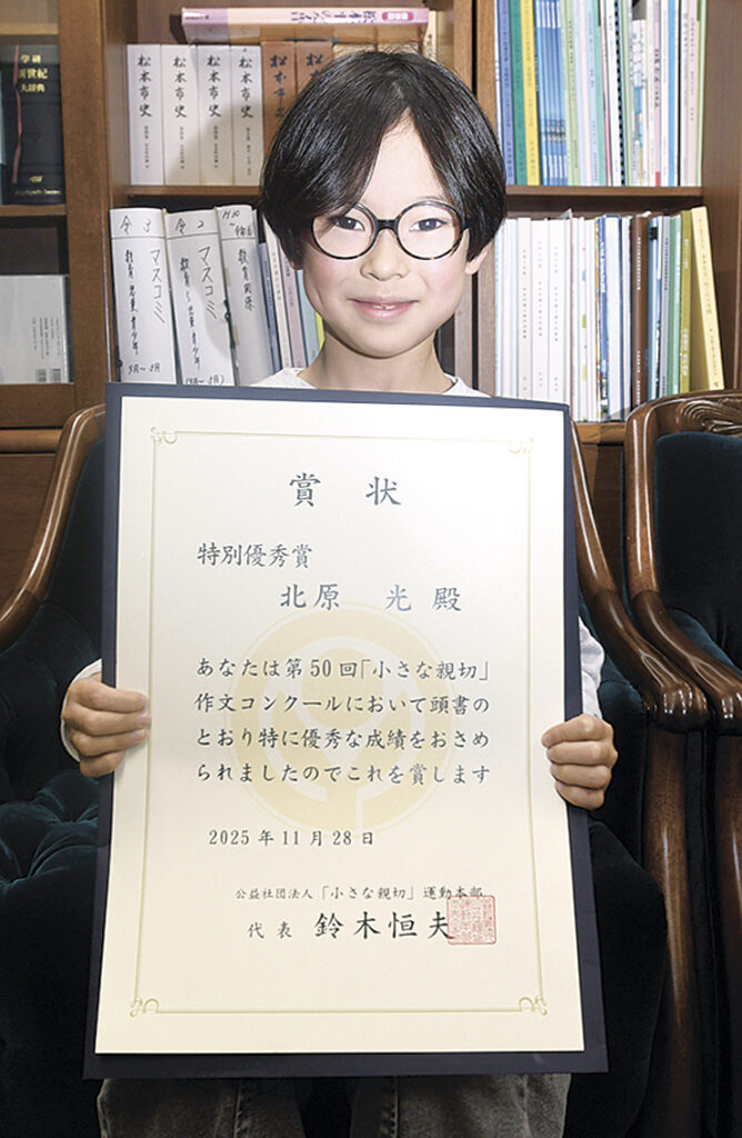 信大付属小の北原光君が全国特別優秀賞 「小さな親切」運動作文コンクール