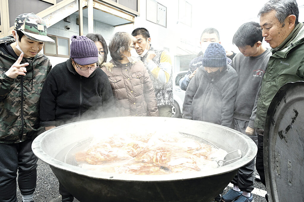 直径1.1メートルの大鍋で、ビニール袋に入ったローストチキンを湯煎した。利用者は被災地での炊き出しに使っている大鍋に興味津々で、熱心に見学する人もいた。あいらいふ南原は被災地へ赴く交通手段として送迎などで使っている車両を提供しており、管理者兼サービス管理責任者の熊切勇人さん(57)は「実際の炊き出しを見せていただける大事な機会にもなった」とプレゼントに感謝した。