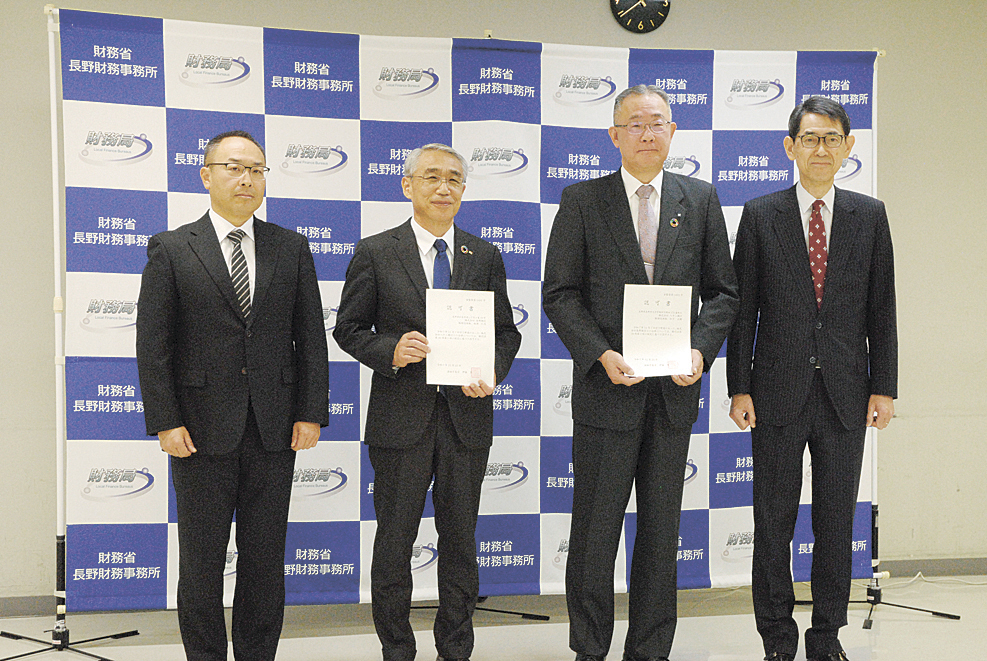 関東財務局長野財務事務所(長野市)で交付式が開かれ、後藤健二局長が八十二銀行の松下正樹頭取と長野銀行の西澤仁志頭取に、それぞれ認可書を手渡した。