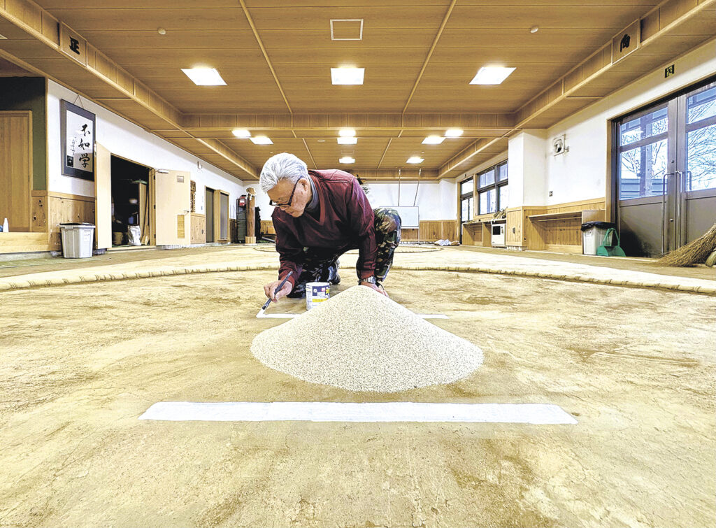 1階の相撲稽古場で、神棚のほこりを払って松飾りやしめ縄を整え、米や塩を供えた。2面の土俵では仕切り線を引き直し、新しい砂を入れて四方を塩で清めた。突っ張りなどの稽古に使う鉄砲柱2本にもしめ飾りが掛けられた。
