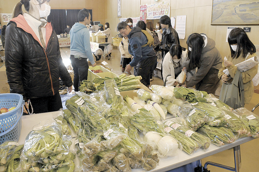 地域の企業や団体、農家や個人から提供された物資が会場に所狭しと並べられた。米は1家庭に5キロを配布。大根、長芋、リンゴといった旬の青果や牛乳、防寒着、生理用品、防災用品などもあり、来場者は必要なものを受け取った。