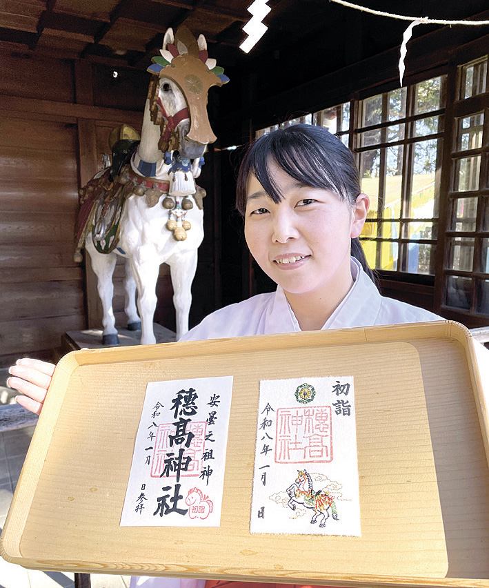 安曇野市穂高の穂高神社は1~31日、恒例の「初詣特別御朱印」を頒布する。午年にちなみ、神社境内の「御神馬」の絵柄を和紙に刺しゅうであしらった御朱印も用意した。