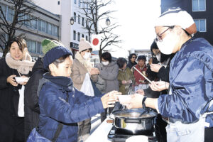 家族3人で参拝に訪れ、境内に並ぶ屋台で軽食を楽しんだ松本市小屋南の会社員の40代女性は「親族の大人たちの年齢が上がってきたので、家族や親、いとこたちが病気にならないようにと願った」とほほ笑んだ。