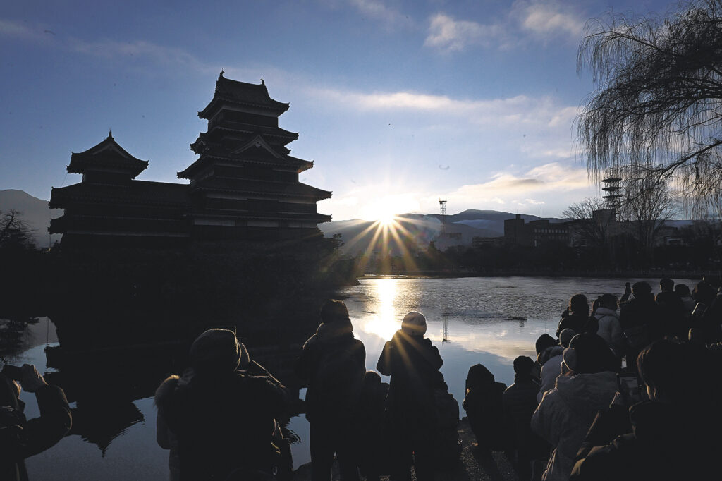 元日の松本地方は穏やかに晴れ、各地で初日の出が見られた。松本城公園(松本市)には市民や観光客ら100人近くが訪れ、午前7時半過ぎに東山から太陽が上がってくると「出てきた」と声を上げ、スマートフォンで撮影する人もいた。