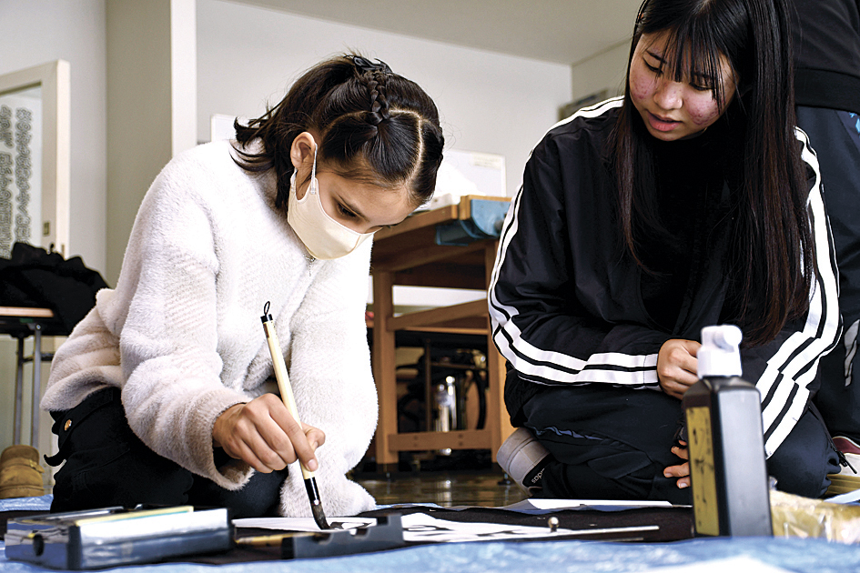 書き初めは松本蟻ケ崎高校書道部の1年生4人が手ほどきし、「正月の朝」「生きる力」など一人一人課題を練習。初めての子供は基本の筆運びから丁寧に教わり、「いいよ」「上手」などと褒めてもらうとうれしそうだった。市民タイムス書き初め展の作品に取り組む参加者もいた。インド出身のオホリ・アナーニャさん(11)=旭町小5年=は「筆の使い方や線を太くするところを教えてもらって上手に書けた」と満足そうだった。
