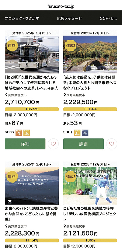 塩尻市は、インターネットで事業資金を調達する、クラウドファンディング(CF)型ふるさと納税を積極的に活用している。現在受け付け中の5件を含め本年度はこれまでに14件の事業で実施した。目標金額は「達成」「未達成」とそれぞれだが、不特定多数の人と接点をつくるという意味で、市は取り組みPRの手法や財源確保の手段として有効だと考えている。