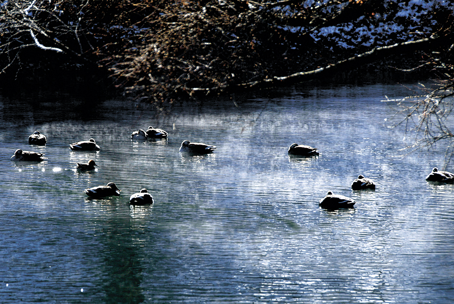 塩尻市宗賀の平出の泉では、水面に湯気のようなものが立ち上る現象が見られた。水温が年間を通じて10度前後に保たれる伏流水が湧き出しており、泉の上に流れ込んだ冷気と水との温度差が大きいことから発生した水蒸気が冷やされ、目に見える形になったとみられる。水面には水鳥が浮かび、みんなで温泉を楽しんでいるかのようなユーモラスな光景が広がった。