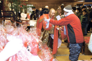 松本市の松本城公園では早朝、内堀の西側から南側にかけて8割ほど氷が張っていた。午前7時ころになると、北アルプスが日の出前後に山肌が赤く染まる「モルゲンロート」であかね色に染まり、観光客らがお城と山並みの幻想的な光景を写真に収めていた。