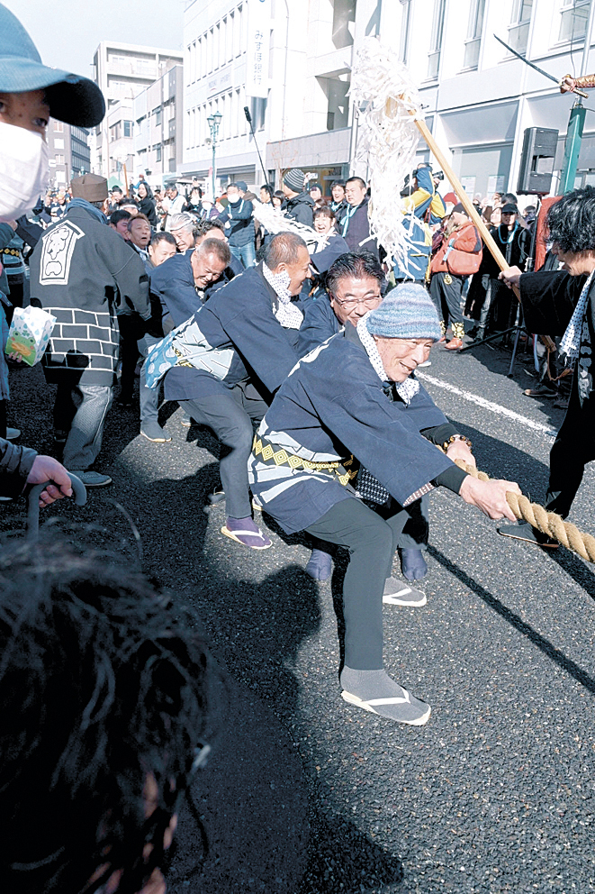商都・松本の新春を彩る「松本あめ市」(実行委員会主催)2日目の11日、松本市中心街の主な通りを歩行者天国にして多彩な催しが行われた。戦国武将の上杉謙信が敵将の武田信玄に義塩を送ったとされる故事「敵に塩を送る」にちなんだ綱引き「塩取り合戦」、縁起物の福あめや福だるまの販売、みこしの練り歩きなどがあり、街が祭りの熱気に包まれた。