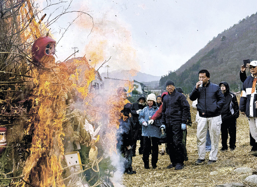 木曽町福島の中畑区では11日、木曽川河川敷に高さ3メートル余りのやぐらが組まれ、点火の時間が近づくと住民らが次々と集まった。火が入ると勢いよく炎が立ち上り、飾られた正月飾りがぱちぱちと音を立てながら燃え上がった。