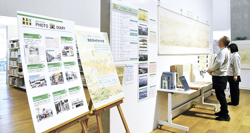 塩尻市立図書館は2月10日まで、市民交流センター・えんぱーく内の図書館本館で、企画展示「塩尻市大門の今昔」を開いている。地域住民からのリクエストに応えた展示で、えんぱーくが立つ大門地区の江戸時代から現在までの様子を地図や写真で紹介している。
