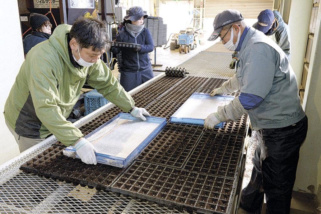 JA職員やアルバイトの8人が作業している。縦25センチ、横40センチほどのトレーに肥料入りの土を入れてならし、直径5ミリほどの種をまいて土をかぶせた。役割分担しながら手際よく進めた。