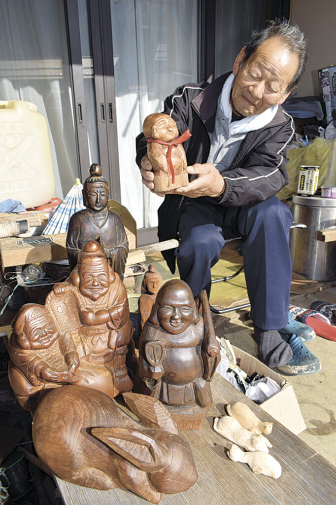 塩尻市宗賀の自営業・向井幸男さん(75)は、趣味で50年にわたって木彫作品を作っている。七福神や干支の動物、鶴や亀、「ピンコロ地蔵」など、見ると明るい気持ちになる物ばかりだ。地域の人に喜んでもらえたらと、地元の小井戸公民館に飾っている。