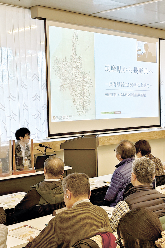 旧筑摩県と旧長野県が合併して現在の長野県が誕生して今年で150周年となる契機に、明治維新後の流れや戦後まで続いた移庁・分県論などについて学ぶ信州歴史フォーラムが18日、松本市大手3の市立博物館で開かれた。同館学芸員・遠藤正教さんが長野県の成り立ちや、分県を阻止して県歌となった信濃の国などについて解説し、約70人が聴講した。