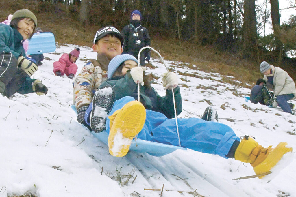 上小曽部にある「げんすけの森 柏茂交流会館」の裏山で開催した。例年より少ないものの、山の斜面には雪があり、子供たちは歓声を上げながらそり遊びを楽しんでいた。会館ではたき火を行い、雪で遊んだ体を暖め、マシュマロなどをあぶって味わった。