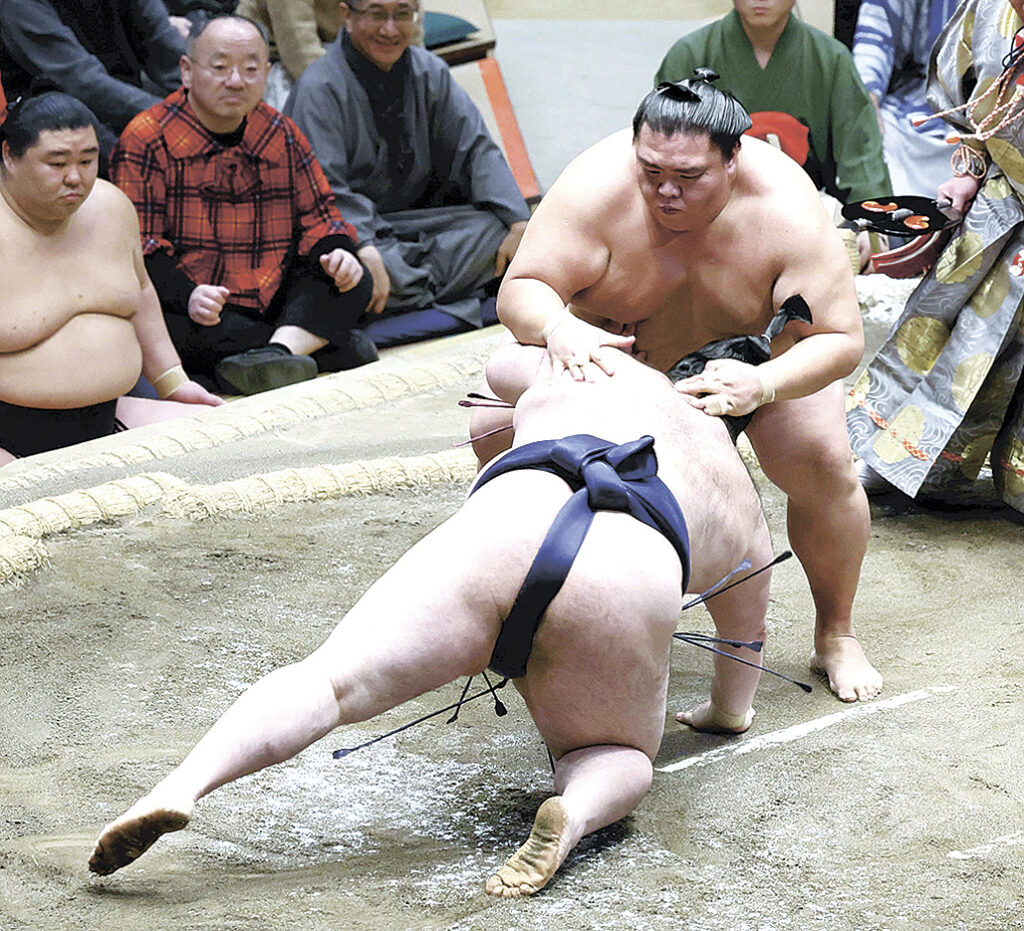 大相撲初場所(東京・両国国技館)11日目の21日、上松町出身の西前頭14枚目・御嶽海(出羽海部屋)は東前頭9枚目・豪ノ山(武隈部屋)をはたき込みで破った。低く突っ込んできた相手を土俵際に追い詰めると、引いてはたいた。星を5勝6敗とし、勝ち越しに望みをつないだ。