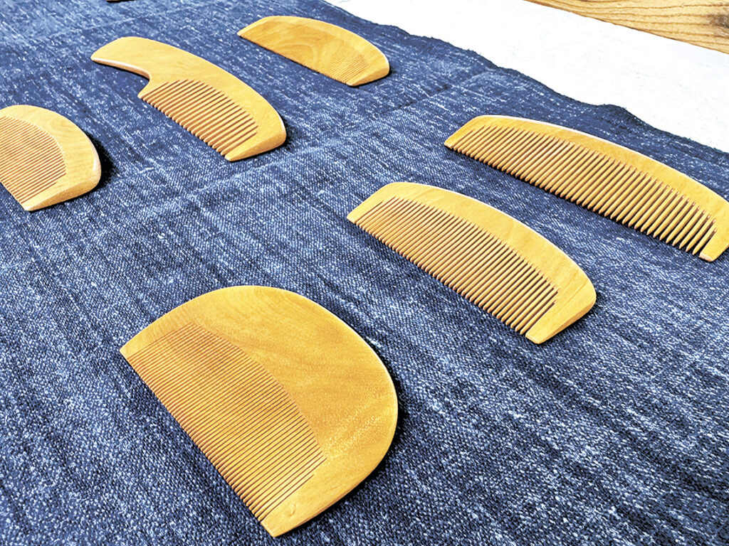 お六櫛 硬く粘りのあるミネバリを素材に、細かな歯を手作業で刻む木曽の木櫛。歯を切る「手挽(び)き」という工程では刃の底に小さな〝山〟が残り、髪通りを良くするとされる。江戸期から続くが、職人は減少し、材料の確保も難しくなっている。道具の多くは職人の自作で、製作環境そのものも貴重な文化要素となっている。