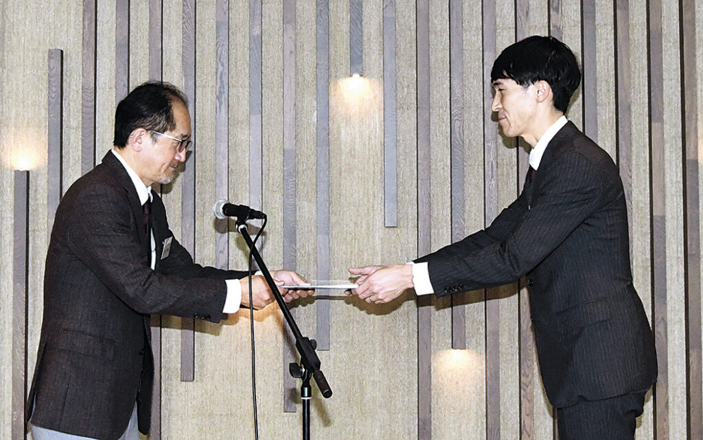アワードは令和6年7月~7年6月に全国70の地域紙が発行した紙面から受賞記事を選び、最優秀賞は「昭和100年紙面と時代と東濃と」を連載した岐阜県多治見市の東濃新報が受けた。式では専門委員で元日本新聞協会出版広報部長の仙石伸也さんが、他の記者と共に井上本店の閉店をはじめ松本市の中心市街地の現状と展望の報道に携わった市民タイムスの久保田貴大記者に表彰状を贈った。