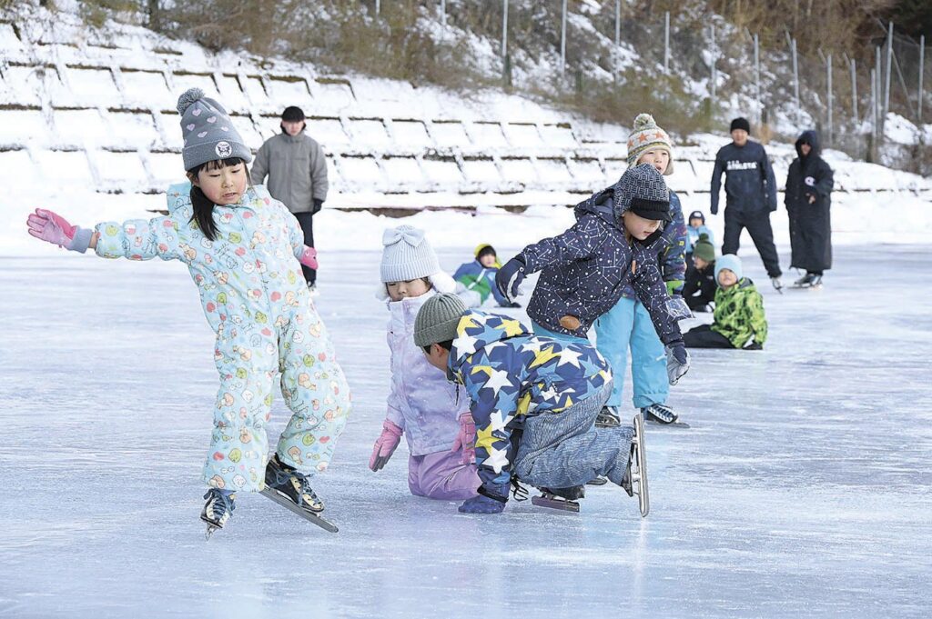 園児たちは2クラス交代でスケート場を訪れ、村スケートリンクの会の会員や保育士、村職員らの指導で滑り方を教わった。初体験の園児も多くスケート靴の履き方から始め、リンク上での立ち方や歩き方を教わると、何度も転びながら少しずつこつをつかんで滑っていた。