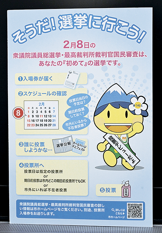 松本市選管も「受験シーズンであり、(学校や生徒へ)直接の啓発はできない」とする。投票所入場券の発送に合わせて、初めての選挙となる18歳の約1300人に「そうだ!選挙に行こう」と呼び掛けるはがきを発送した。従来の取り組みだが、百瀬誠事務局長は「はがきで投票に関心を持ってほしい」と願っている。