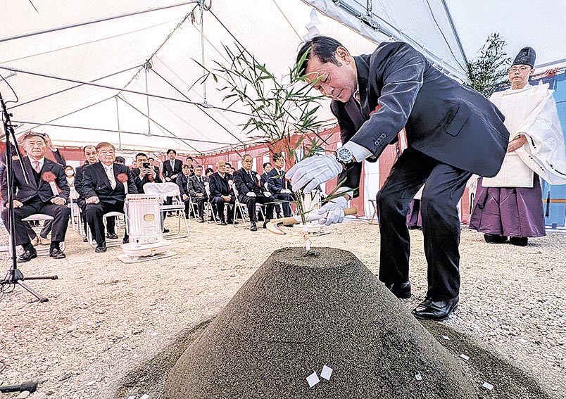 神事では、百瀬村長とサンリン会長でサンエネック社長の塩原規男さん、d―ネクストの廣田一博社長、松本土建の大池太士社長がそれぞれ「地鎮の儀」に臨んだ。