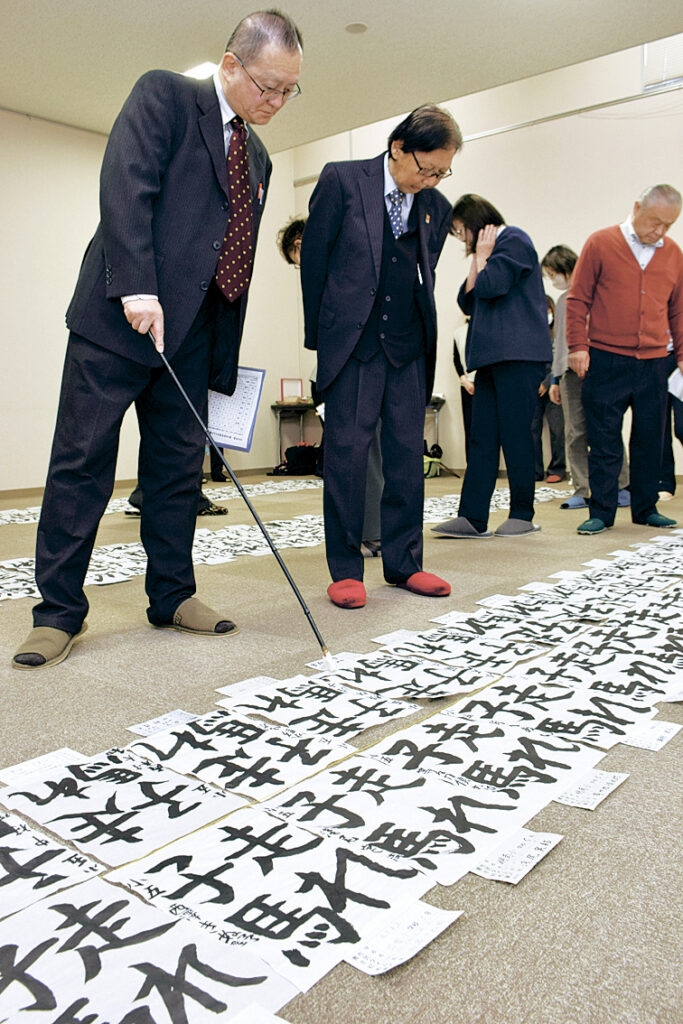 書き初めの力作を審査 市民タイムス展に1968点の応募