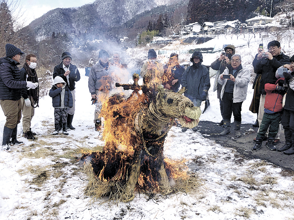 地元の中野博充さん(77)によるとかつては子供中心だったが少子化に伴い高齢者の行事となり、現在は集落皆で行う。実施日や方法を変わらず継承する一方、屋外での火の扱いを禁じる林野火災注意報が今年から運用される中、新たな難しさも浮上しているという。「何代もで守ってきた行事。これからも続いていくように」と願っていた。