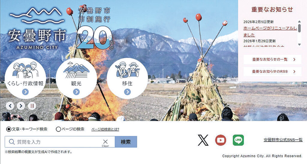 安曇野市は、市の公式ホームページ(HP)をリニューアルした。アクセス時に最初に表示される「フロントページ」を新たに設け、AI(人工知能)を搭載した検索機能も追加。情報の見やすさと探しやすさを向上させた。
