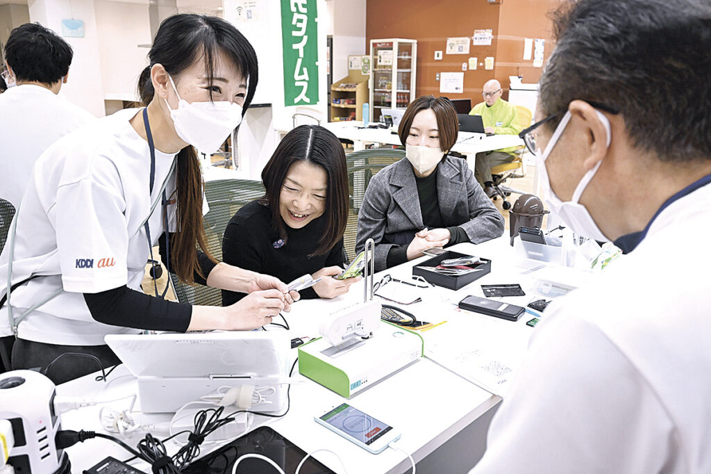 ミソテックの関連事業で、通信事業大手のKDDI(本社・東京都)は13日と14日、松本市のサザンガクで、家庭に眠っている携帯電話(ガラケー)の写真などのデータを復活させる企画「おもいでケータイ再起動」を実施している。初日は25組が訪れ、友人や家族と撮影した写真などをよみがえらせていた。市民タイムスが連携し、写真に記事を添えて新聞に仕上げて贈呈する「おもいで新聞」を希望者に展開している。