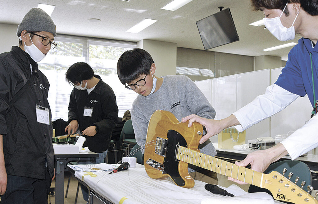 フジゲンのブースではエレキギターの組み立てを体験した。ピックガードやチューニングパーツのビス留めをしたり、弦を張ってチューニングをしたりと夢中で取り組んだ。今年で3回目の参加という芝沢小学校5年生の大池慧君は「貴重な体験ができてすごく良かった」と話し、完成したギターで曲を弾いて楽しんでいた。