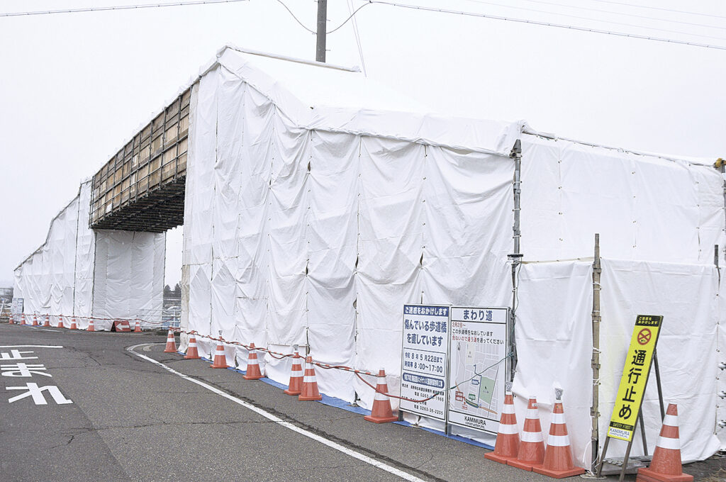 県道に巨大なゲート出現―?。松本市の小屋北2と小屋南1の県道松本環状高家線に白いシートで覆われた建造物が現れた。県松本建設事務所が補修工事をしている「小屋横断歩道橋」で、県道を通過すると大きなゲートをくぐるような感覚になる。歩道橋は4月末までの予定で通行止めになっている。