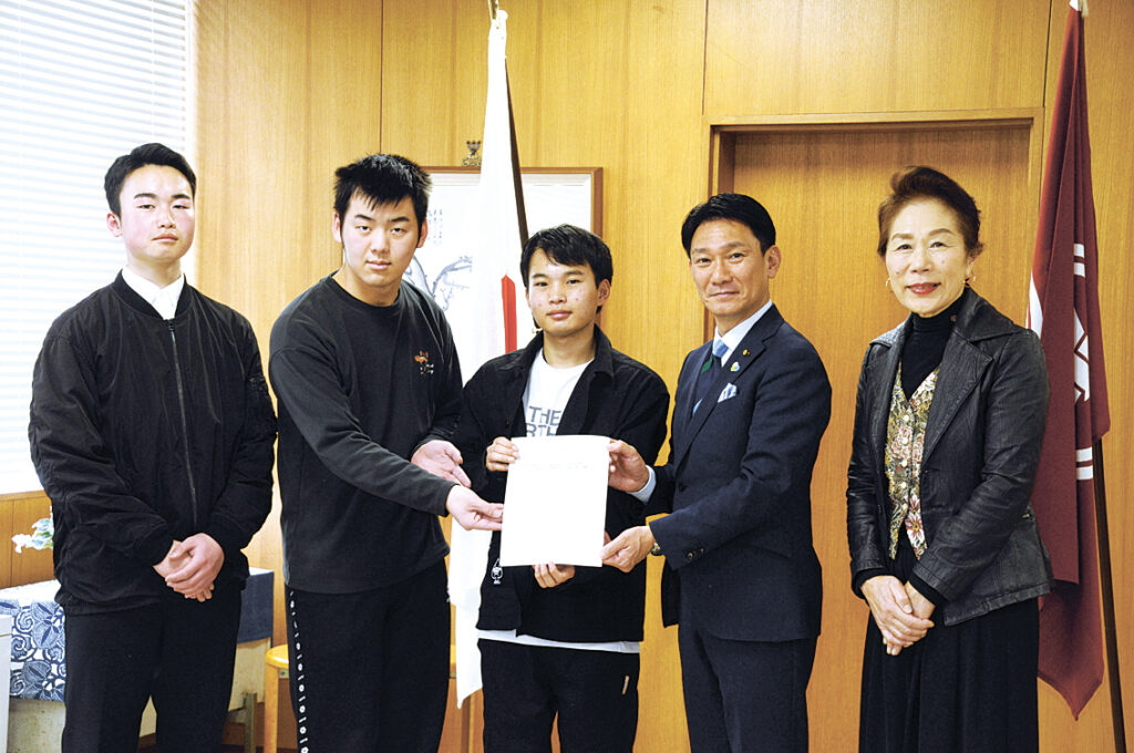 3年生の降幡玲央さん(18)、青山愛紀さん(18)、粟津原輝さん(18)が市役所を訪れ、阿部功祐議長と吉村幸代副議長に請願書を届けた。請願に必要な紹介議員は、全6会派の議員が名を連ねた。